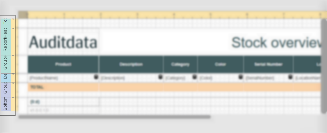 When editing a report template, the Report Designer interface consists of the following main areas: