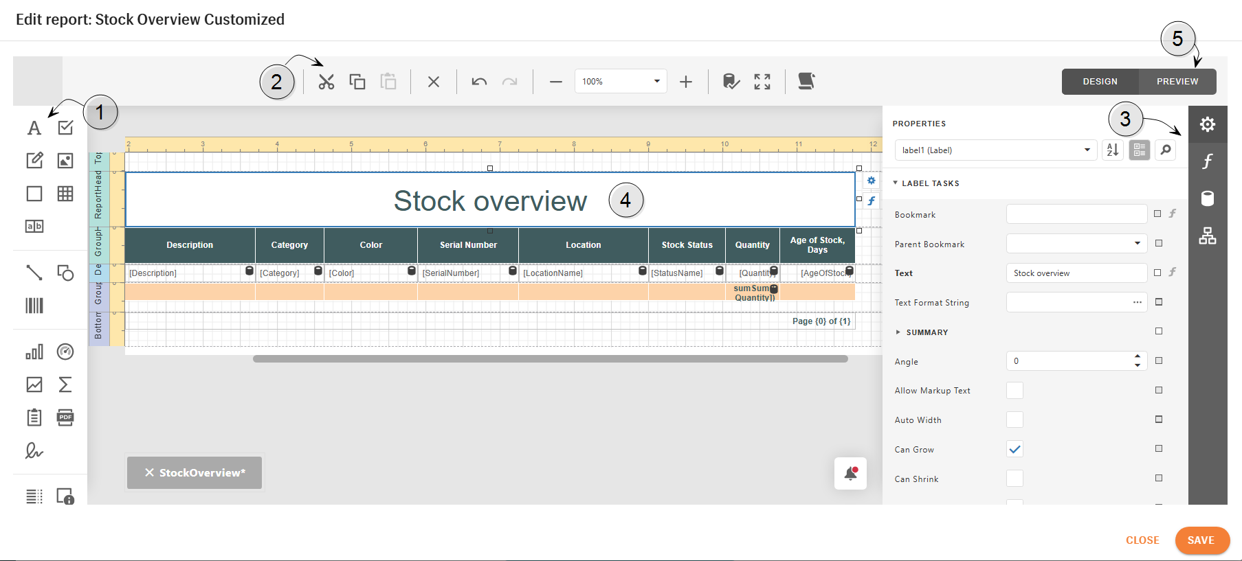 Preview mode shows how the report will look with real data before saving or using the report.