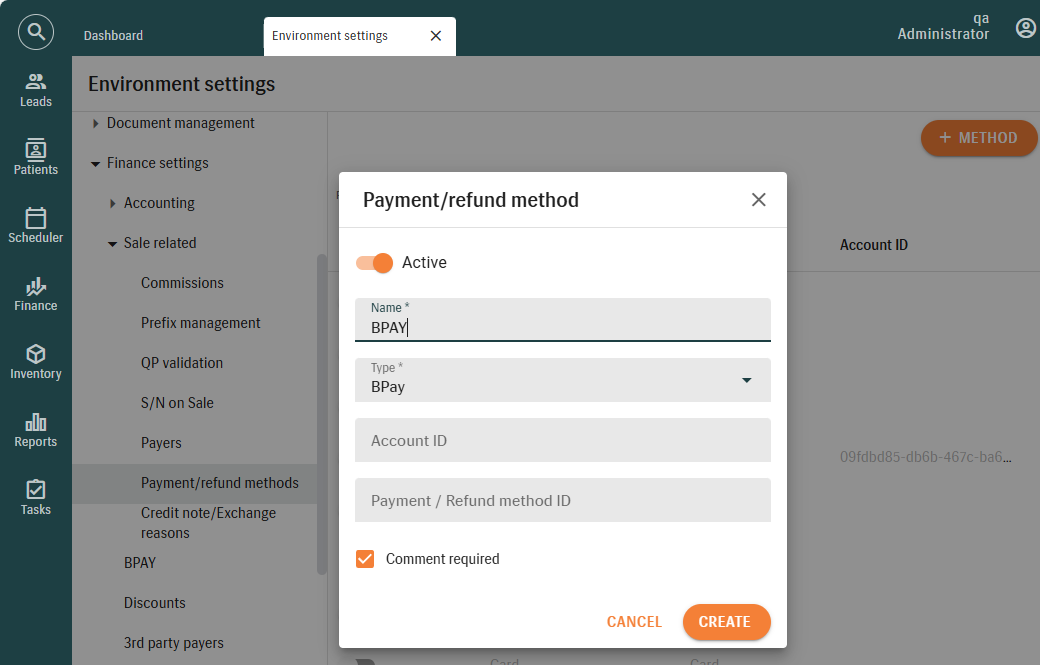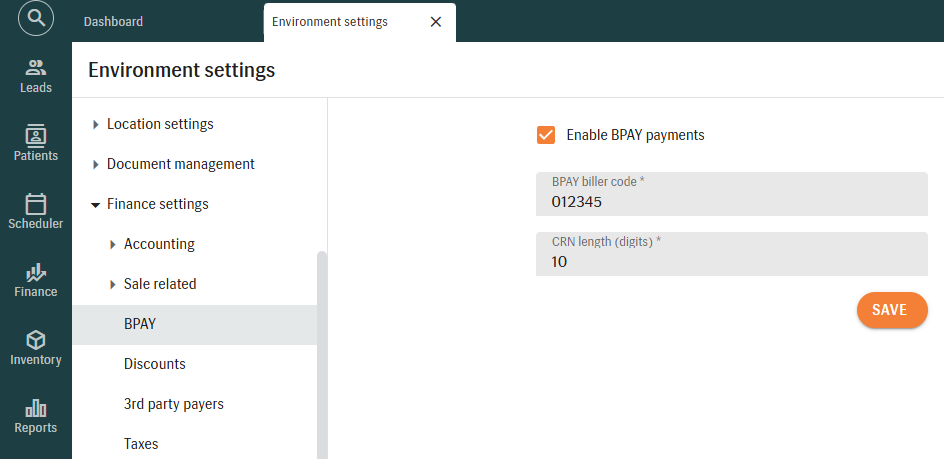 After enabling BPAY, a payment method with type “BPAY” must be created in: Finance settings > Sale related > Payment/refund methods.