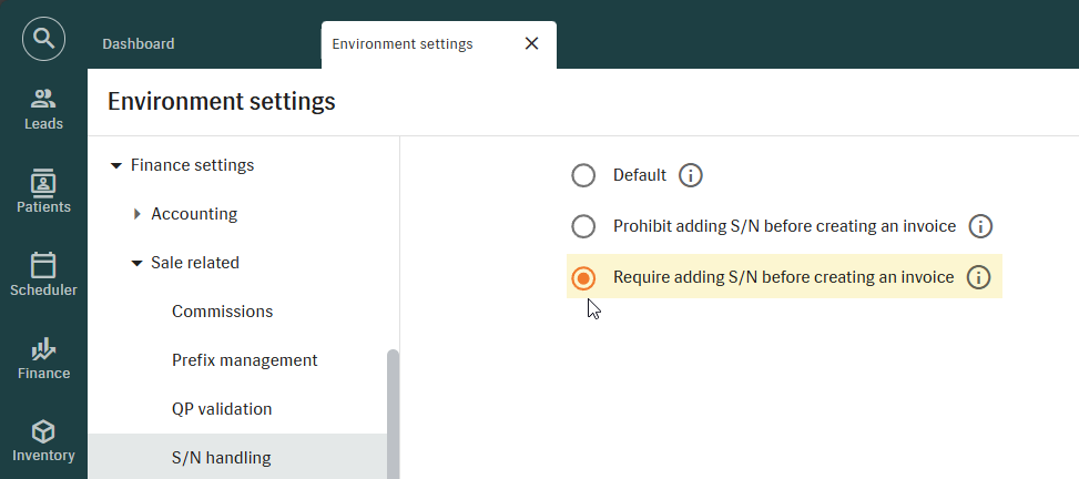Serial number (S/N) handling options define how S/Ns are managed during sales and invoicing. These settings determine whether entering serial numbers is optional, restricted, or required before an invoice can be created. This supports traceability for serialized items while allowing flexibility for non-serialized workflows.