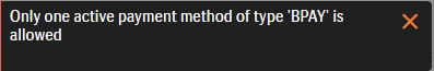 Only one BPAY payment method may be active at any given time. An attempt to add another active BPAY payment will trigger a warning.