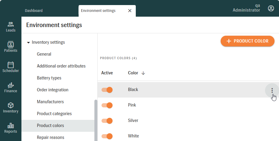 To view or modify a color, hover over it, select the options menu (three dots), and choose EDIT. The available actions depend on whether the color is already assigned to any product.