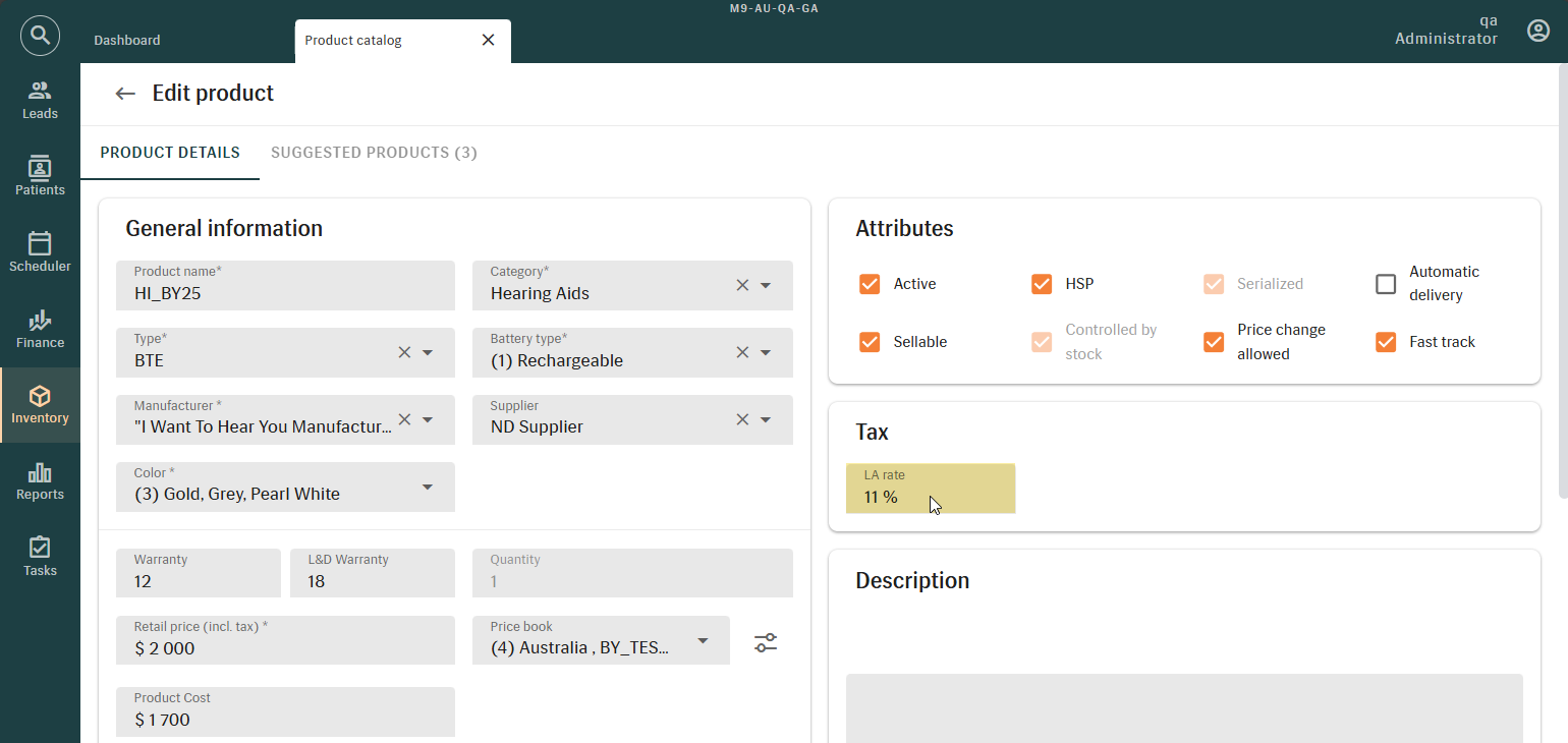 To adjust the tax rate on individual products, navigate to Inventory > Product catalog. Save to apply changes.