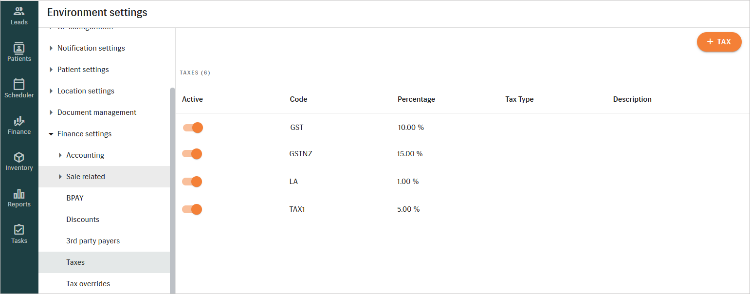 - Configure at least one tax code under Environment settings > Finance settings > Taxes.