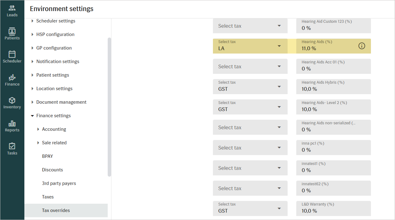 To assign the tax to Product categories or adjust tax rates, go to Environment settings > Finance settings > Tax overrides. Save to apply changes.