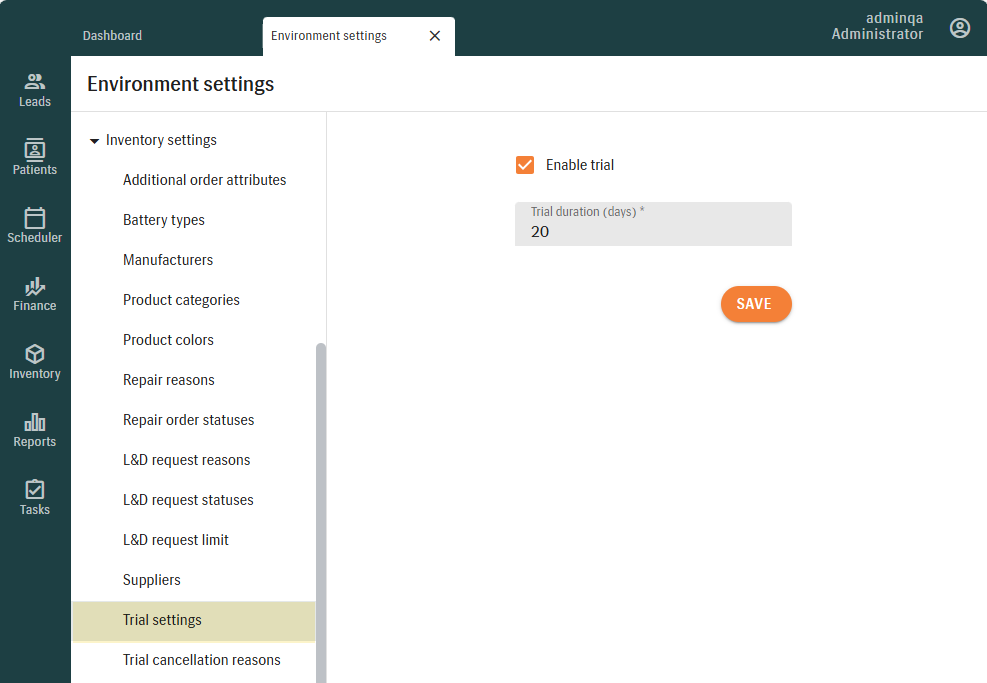 Environment settings > Inventory settings > Trial settings / Trial cancellation reasons