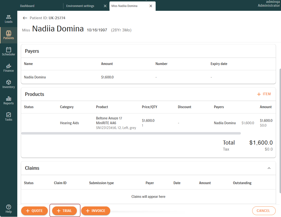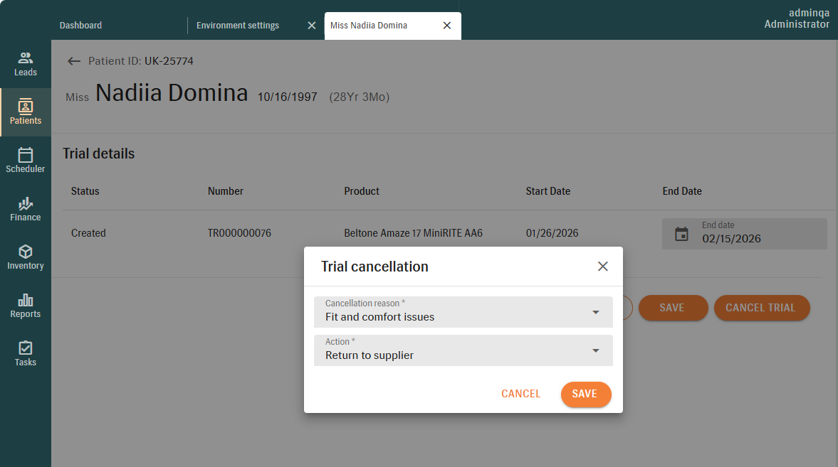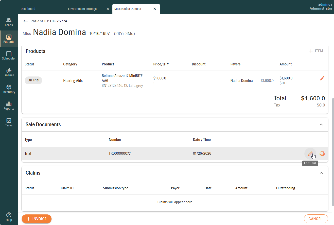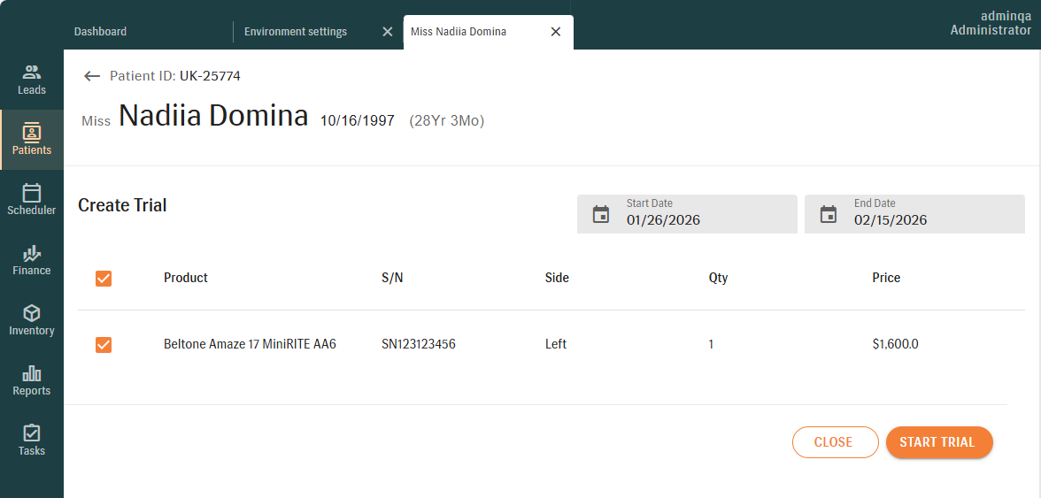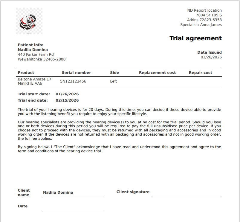 Trial management and reporting is now available for users in the US, allowing clinics to start and manage trial periods for serialized hearing aids during quote creation or at the point of sale. Users can select an eligible product, set the trial dates, and begin the trial – the system then updates the product status and creates a trial document.