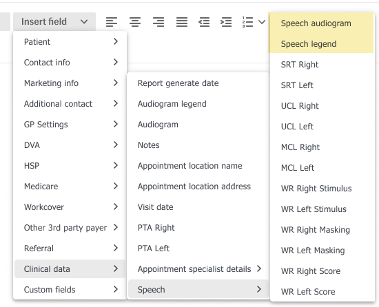 Speech legend — allowing Speech Graphs to be included in printed or exported reports whenever Speech data is available. These insert fields can be added to Report templates via