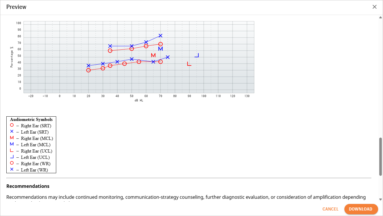 A new Speech Graph has been added to Manage, giving clinicians a clearer, more visual way to review and explain speech‑related test results. Until now, only Pure Tone graphs and Speech tables were available. This update adds a full graphical view of key Speech metrics — making clinical interpretation faster and improving the quality of information shared with patients and referrers.