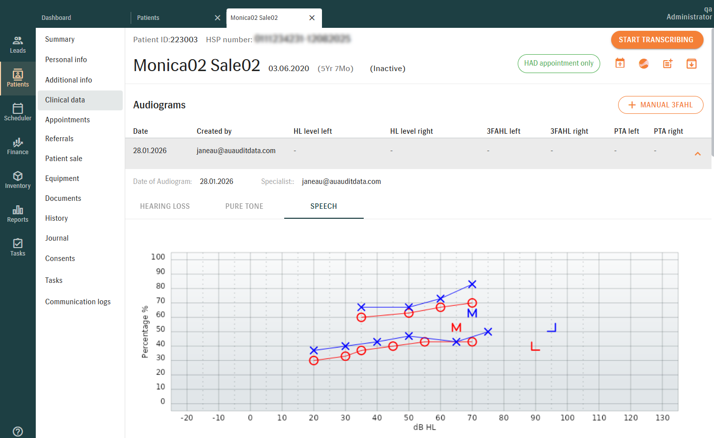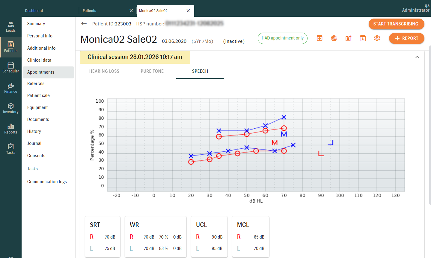 This enhancement uses the existing Speech graph component and extends it across the Clinical Details (Clinical data tab), Appointment Summary (Appointments tab), and Appointment Reports. As part of this update, Speech data now appears on its own tab, following the restructuring of the Clinical data view into three separate tabs — Hearing Loss, Pure Tone, and Speech — to improve navigation and accessibility.