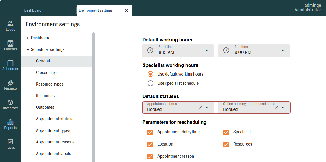 When an appointment is created in Scheduler, the configured default status is automatically applied.