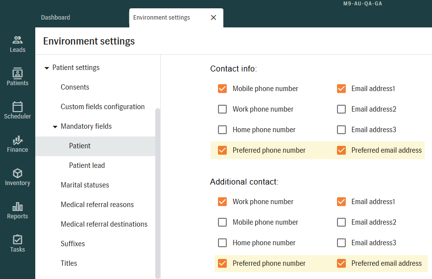 Environment settings > Patient settings > Mandatory fields > Patient/Patient lead