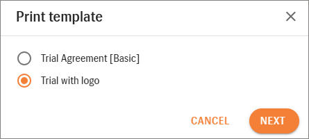 If multiple templates are available, Manage will prompt you to choose which one to use before printing. Templates can be configured in Environment settings > Print settings > Printing templates.