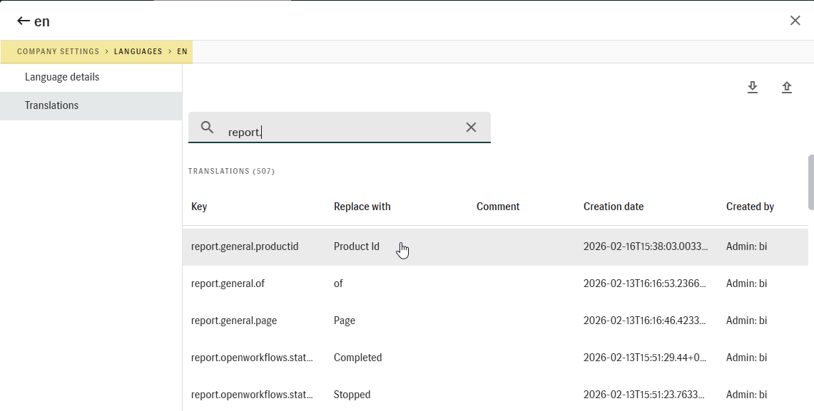 Company settings > Languages > [selected language] > Translations tab
