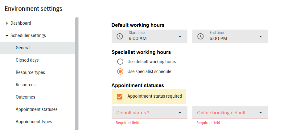 The "Appointment status required" setting is turned off by default but can be enabled at any time. When activated, the setting affects appointments created in Manage, through Online Booking, and via Public API. It does not apply to appointments created through external integrations with their own booking rules, such as NHS eRS.