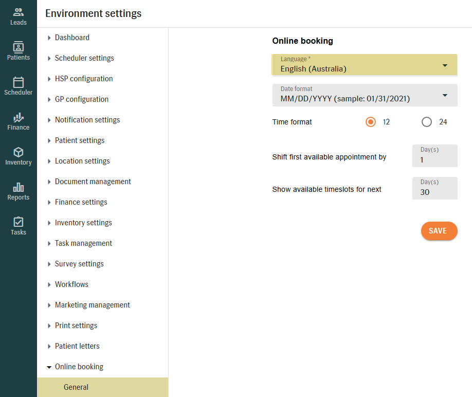 - If the patient’s browser language is not supported, the system uses a default language that you can define in your clinic’s Online Booking settings in Manage (Environment settings > Online Booking > General).