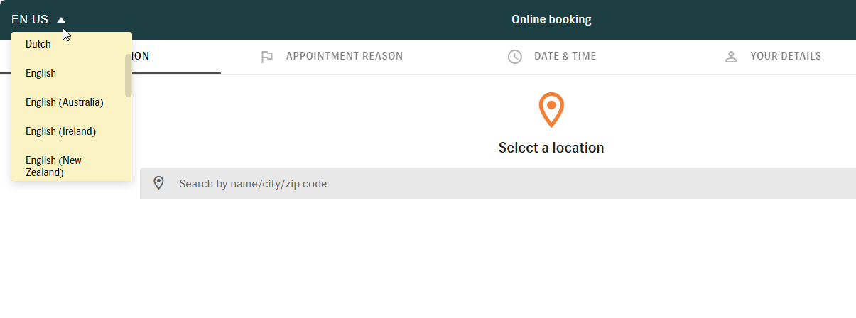 - Online Booking automatically displays in the patient’s browser language if it is supported by your clinic. Patients can manually switch between supported languages using the language selector.