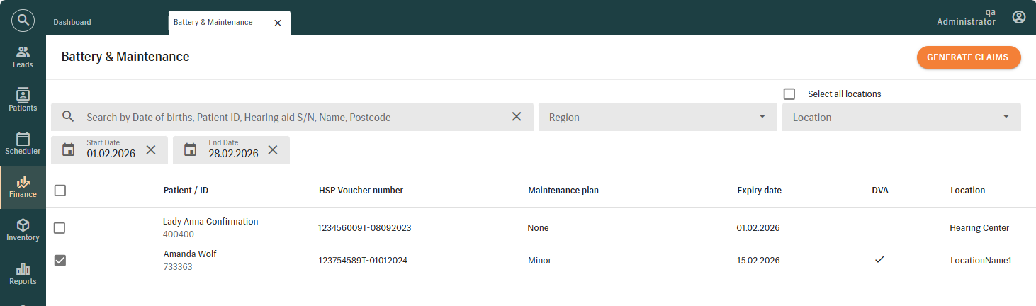 - Navigate to Finance > HSP > Battery & Maintenance page.