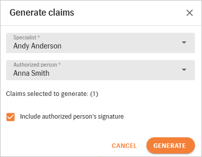 - In the Generate Claims dialog, provide relevant details. Complete the claim generation as usual.