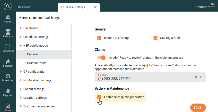 - To be able to automatically create quotes during B&M claim generation, enable the setting “Enable B&M Quote Generation” in Environment settings > HSP configuration > General. The setting is disabled by default.