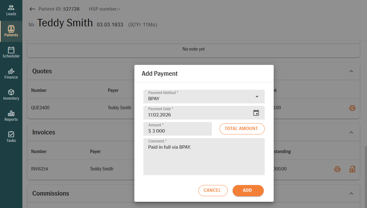 BPAY becomes available only after it has been enabled in Finance settings. Once activated, it can be used exclusively for private payers and is not available for funders or insurance companies.