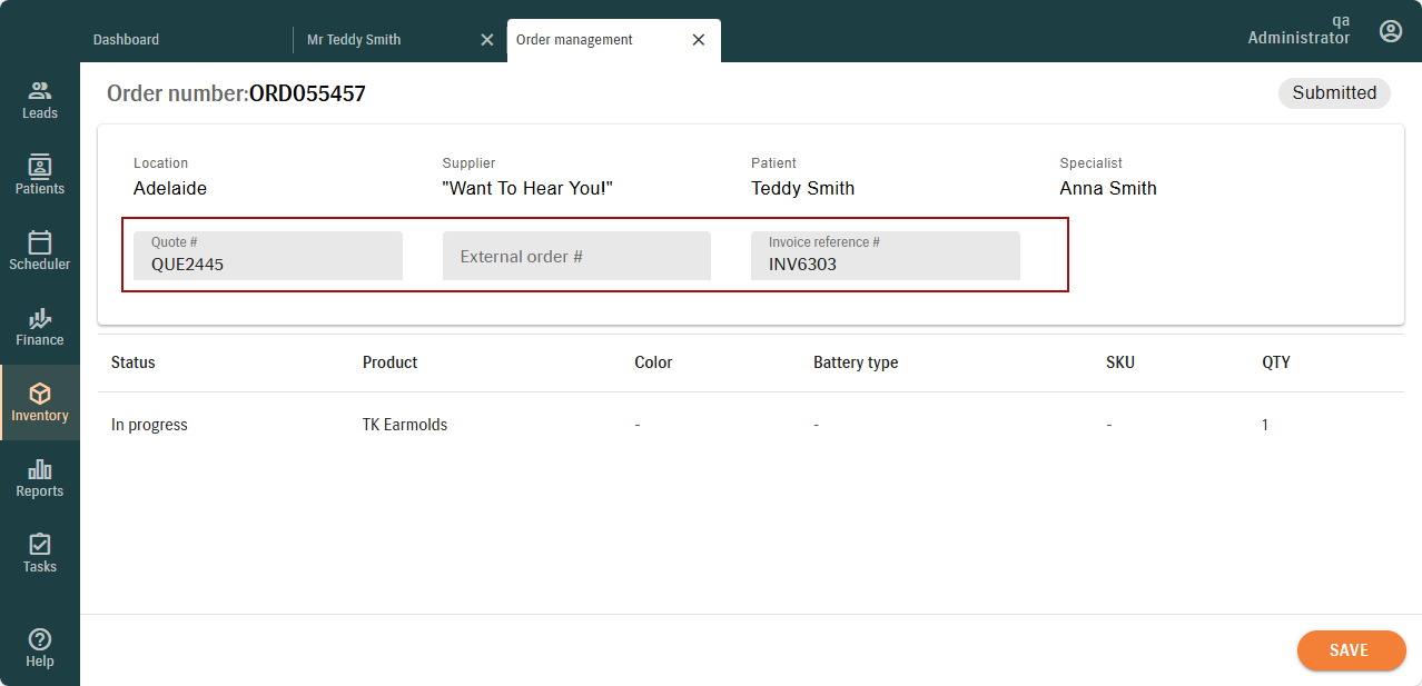 - In Draft and Submitted statuses, selected reference fields – Quote #, External Order #, and Invoice Reference # – remain editable.