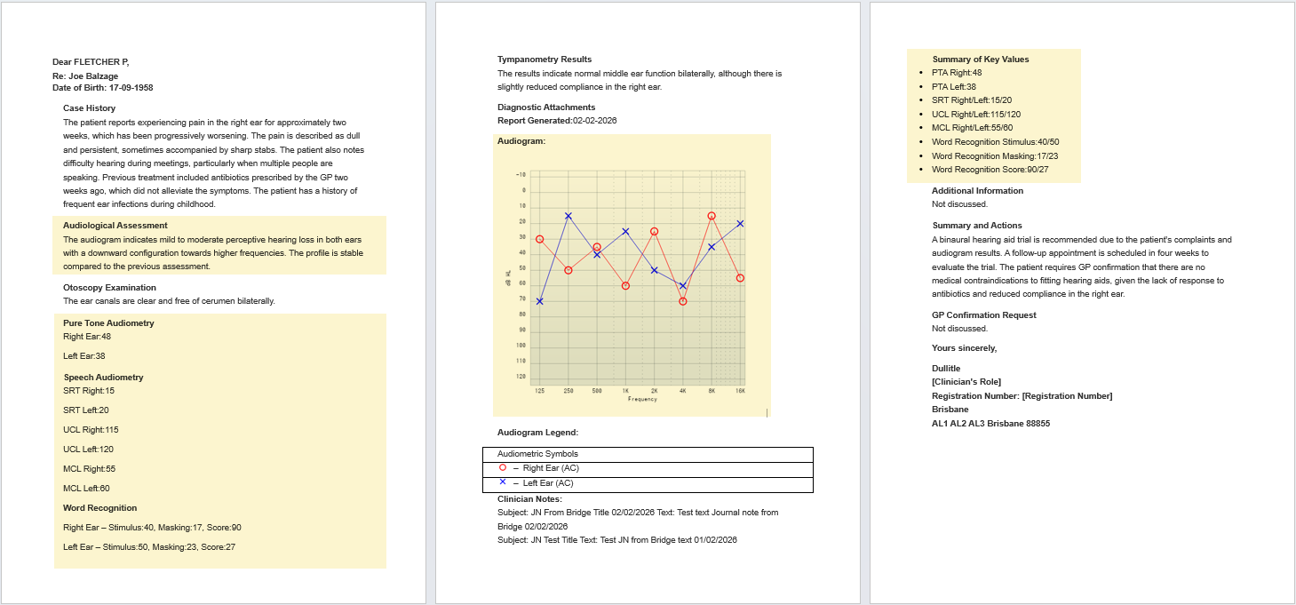 AI-generated GP referral letters now automatically include the patient’s most recent audiogram. This improvement ensures referral letters are more complete, standardized, and clinically informative for GPs.