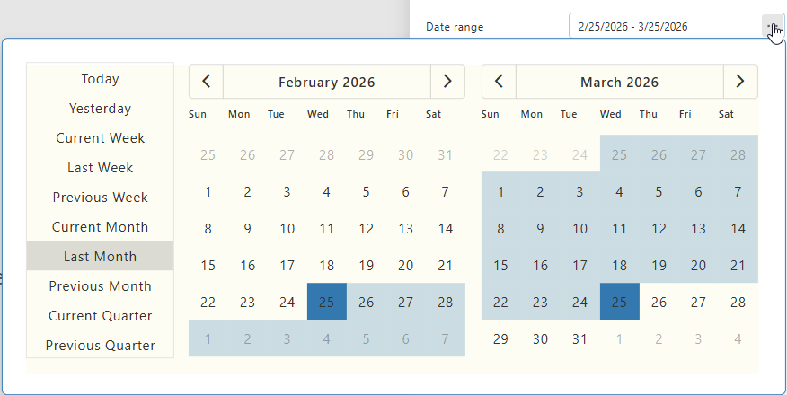 This change improves usability by enabling selection of a full period in a single interaction, making the applied range clearer and reducing the risk of invalid or inconsistent inputs. It also speeds up filtering through fewer clicks and support for predefined ranges (e.g., Today, Current Month, Last Month).