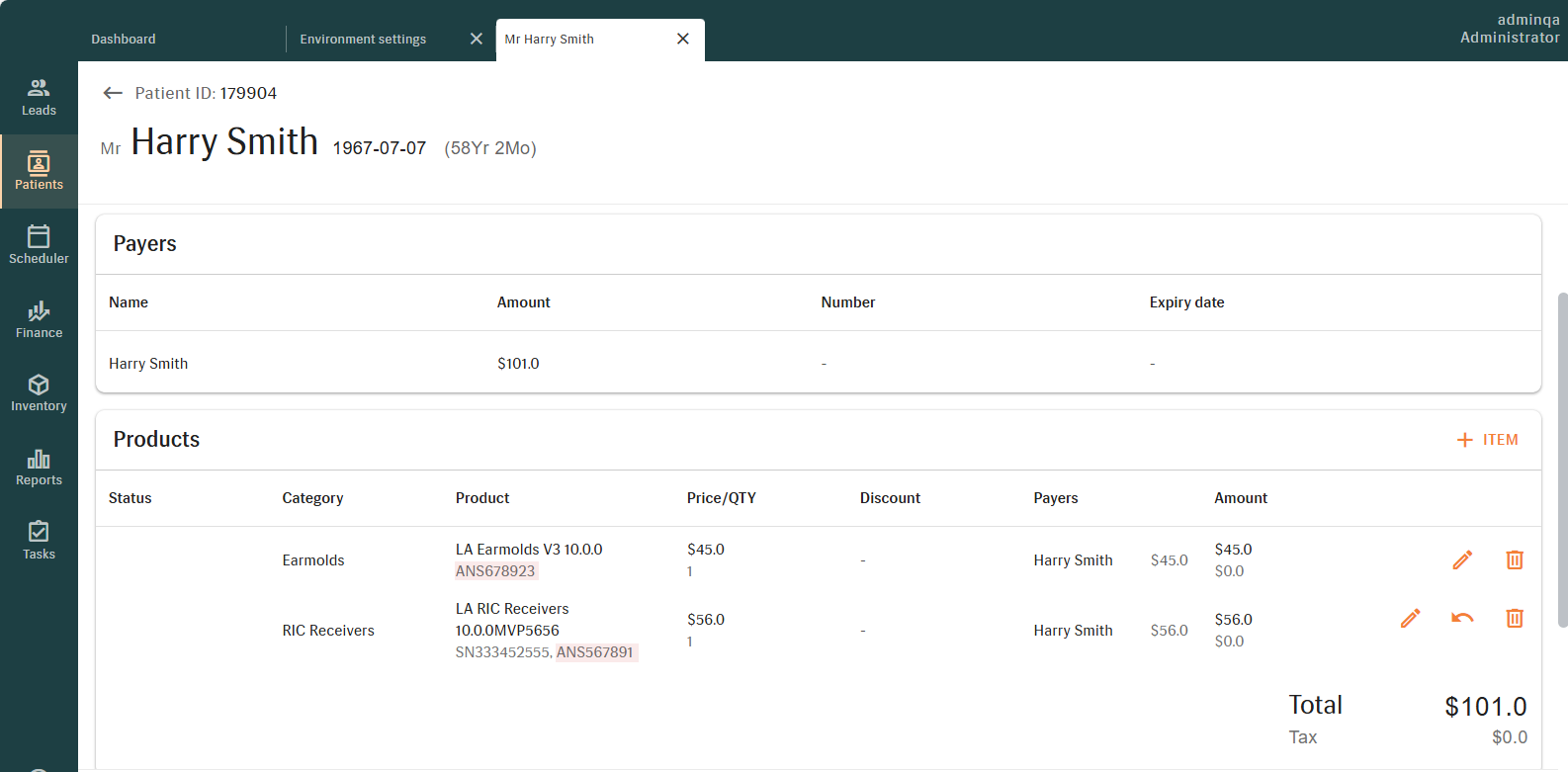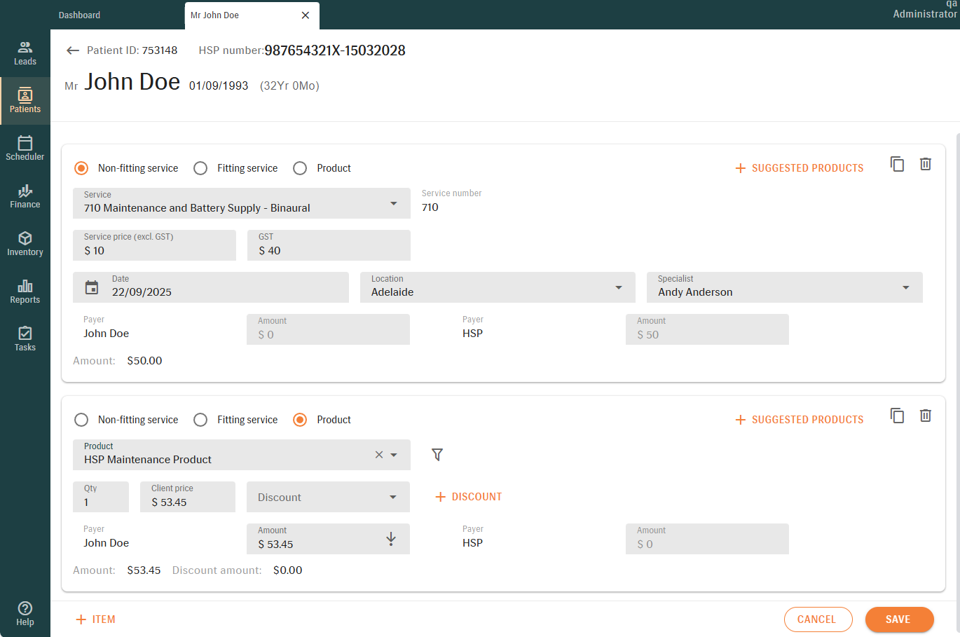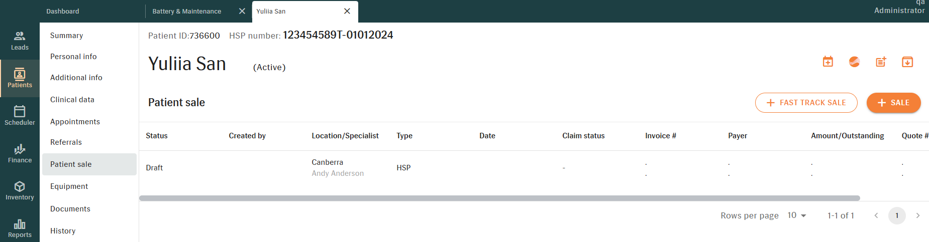- On the Battery & Maintenance page, click a patient entry to open a Patient sale tab.