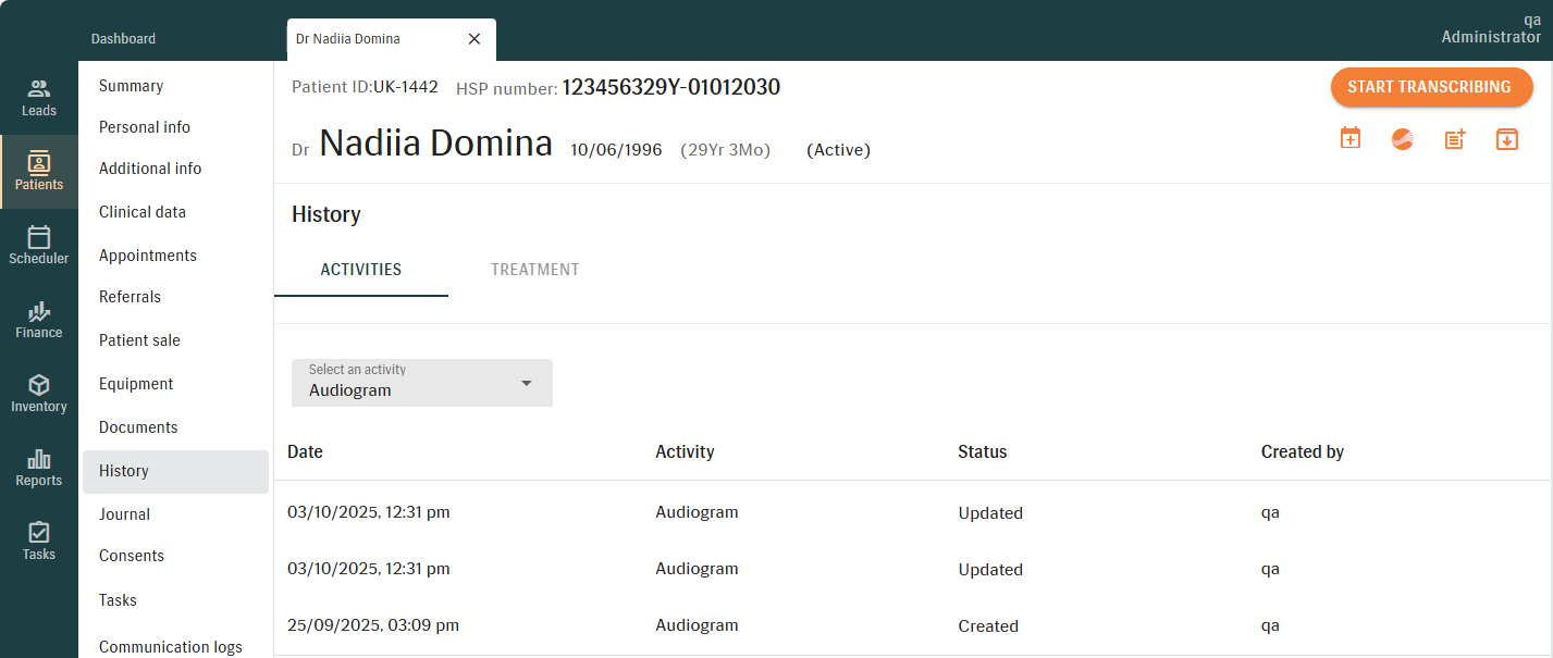 - Click Create to save the entry. The new record will appear under Audiograms, showing the selected date, entered values, and the user who created it.