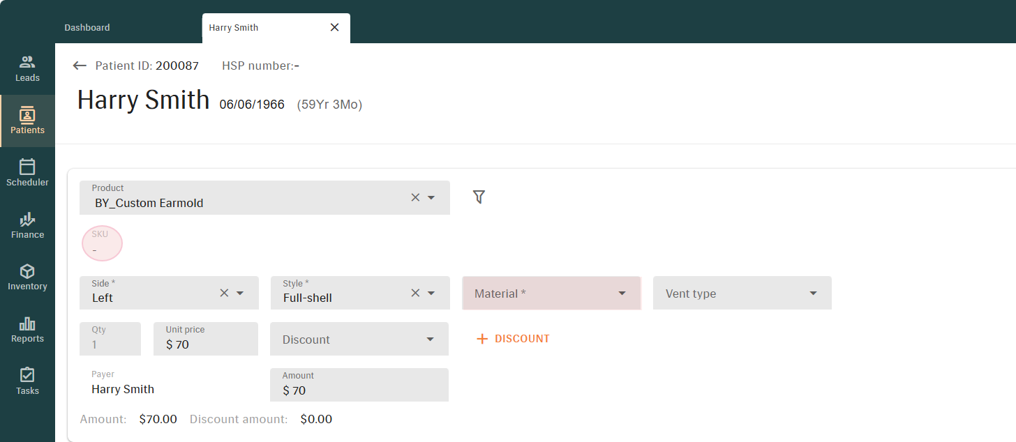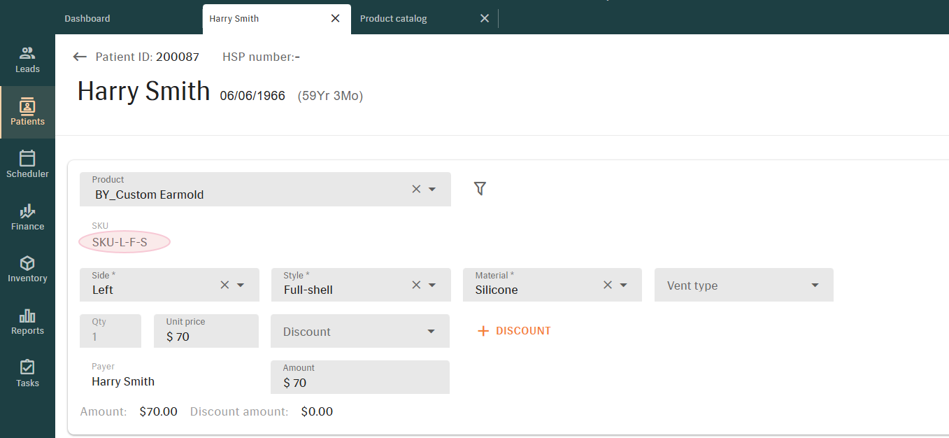 - If an SKU has been configured for an earmold using the Side attribute, then Side becomes mandatory for selection on the Products page within a Patient sale tab. Other attributes that define the SKU (e.g., material, style, etc.) must also be selected by the user for the SKU to be displayed.