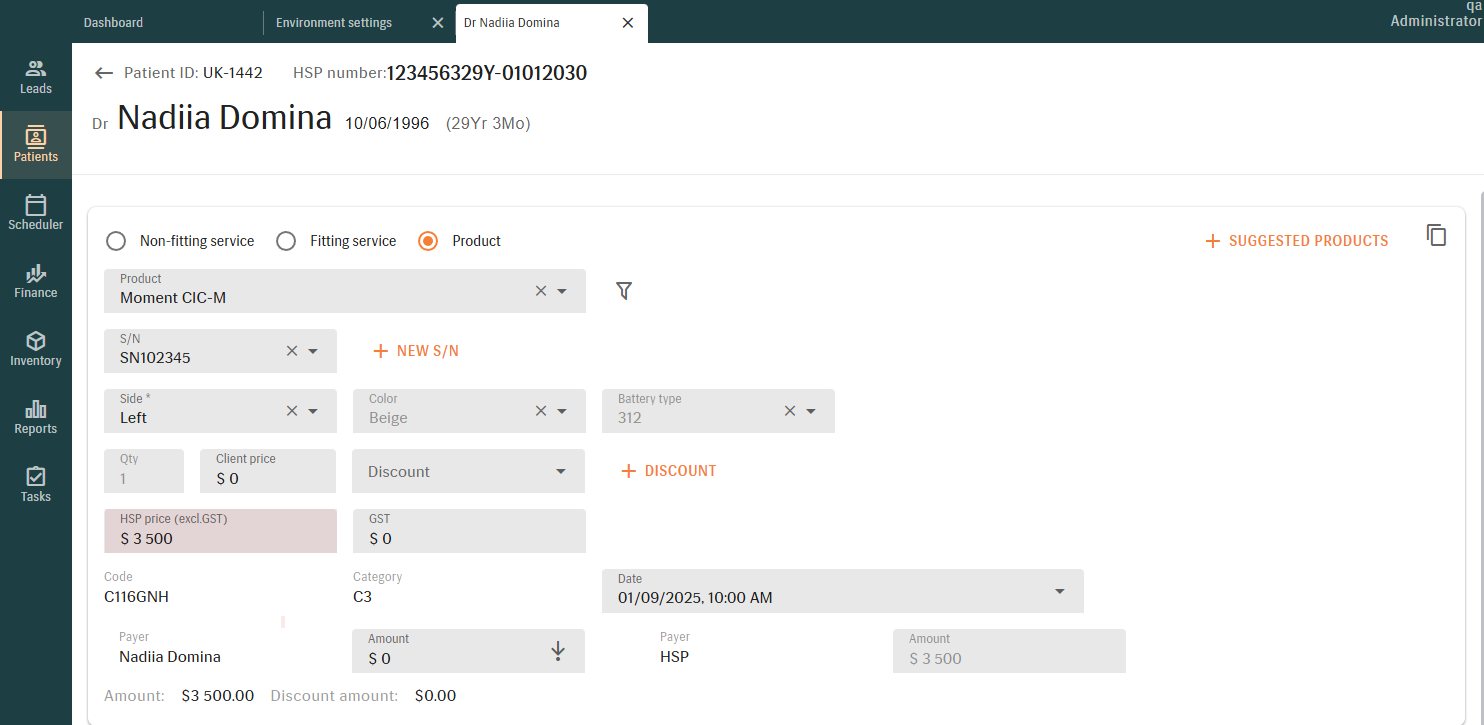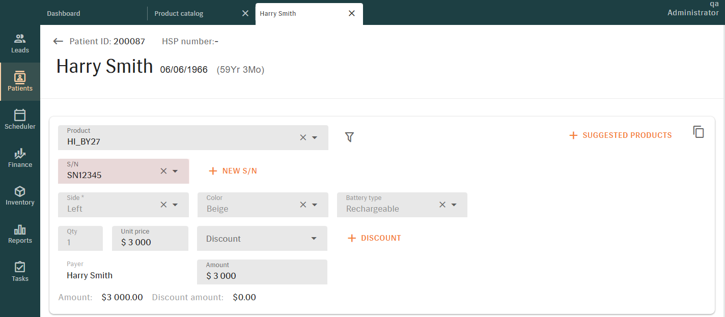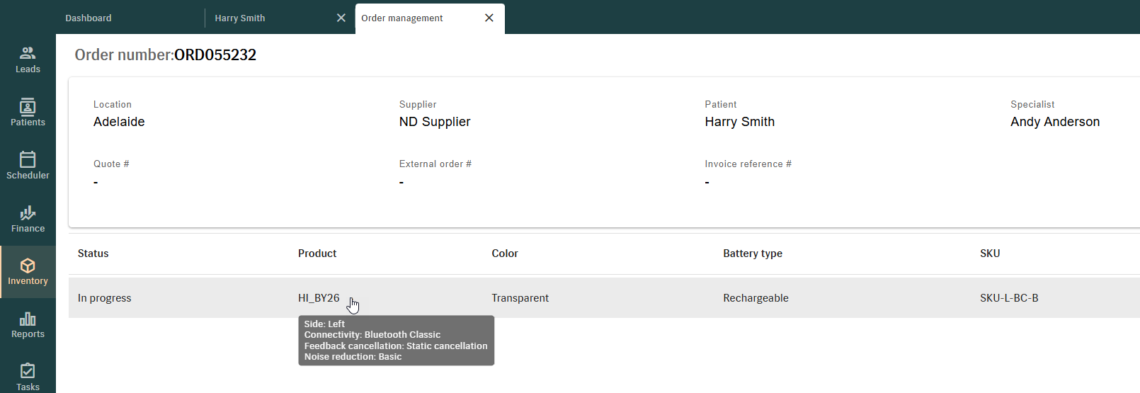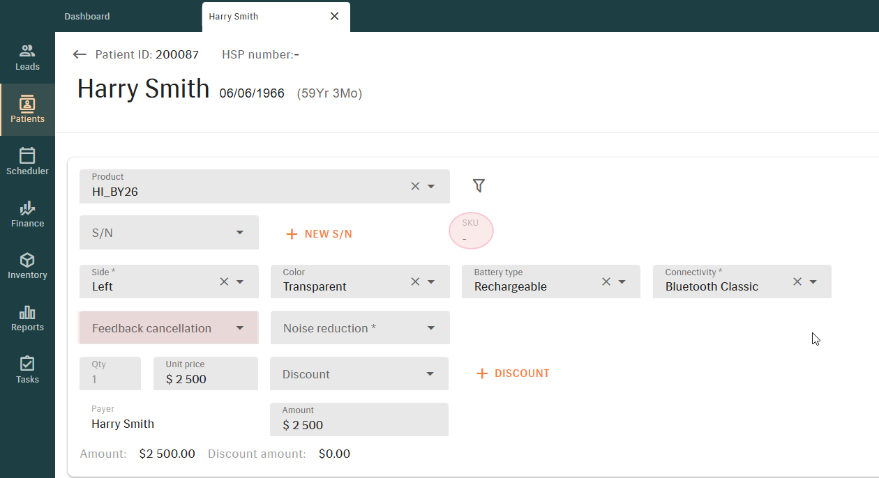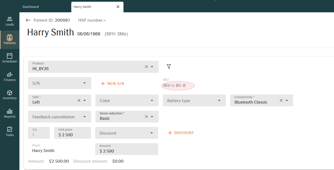 - If an SKU is configured for a product, it is displayed on the Products page within a Patient sale tab based on the selected attributes (e.g., side, connectivity). The attributes that define the SKU must be selected by the user.