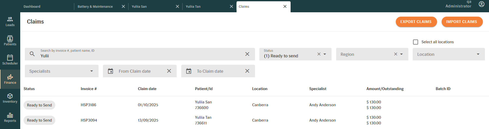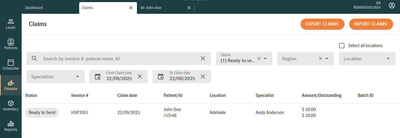 - Process all the claims in the batch until they are "Ready to send". Ready-to-send claims can be exported to HSP from the Finance module > HSP > Claims page.