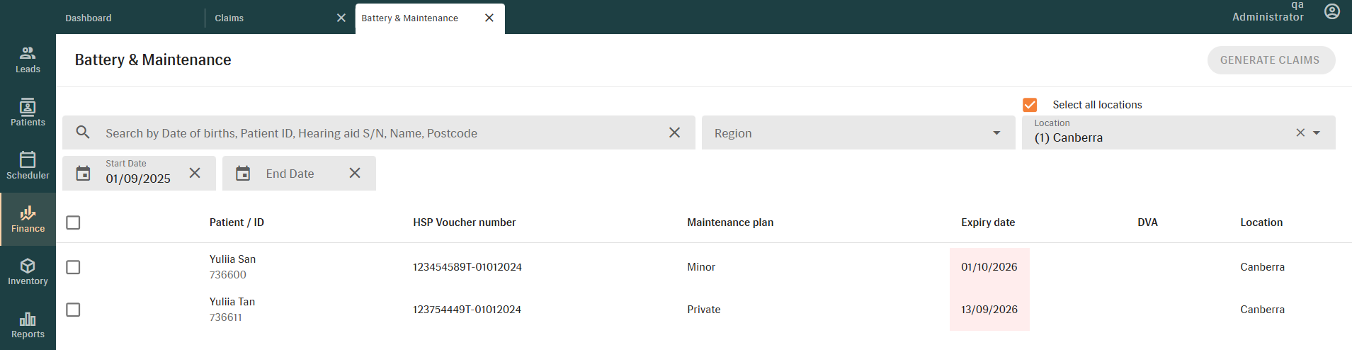 If the patient’s B&M expiry date is missing, it will not be possible to create a claim for that patient. As a result, no record of the claim will appear in the Finance module under HSP > Battery & Maintenance.