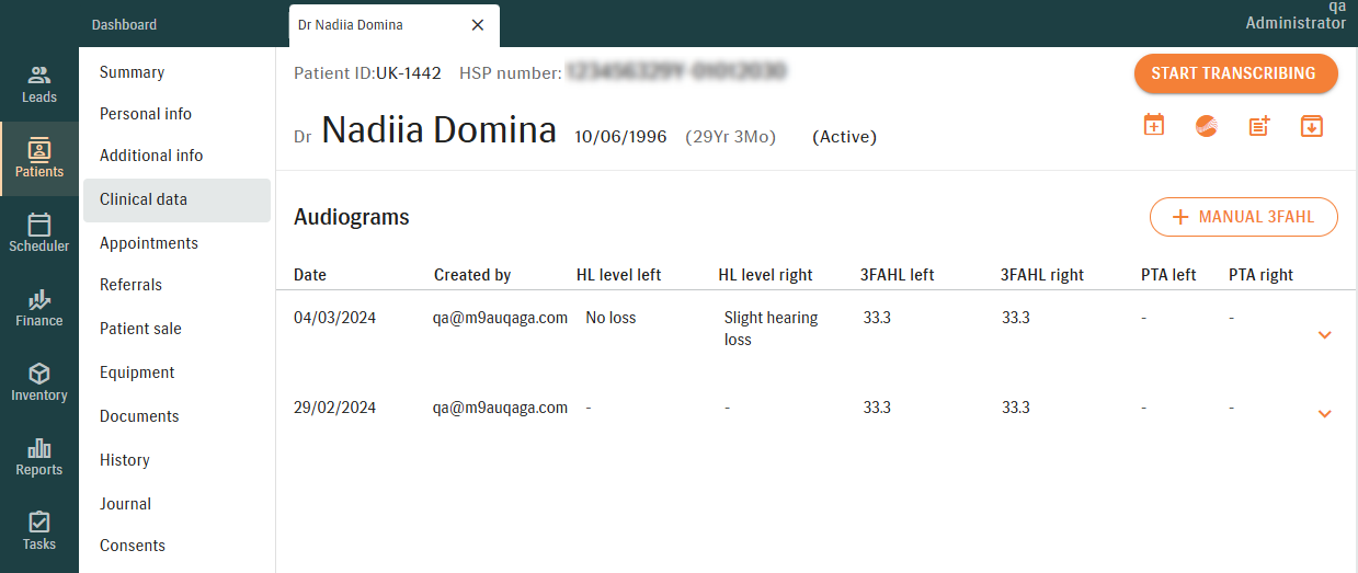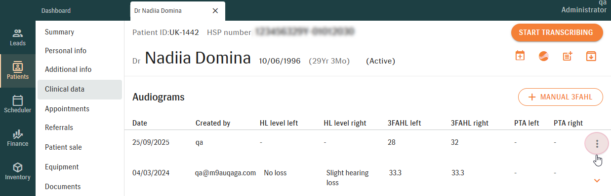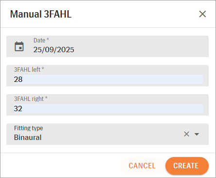 Audiologists can now manually enter Three-Frequency Average Hearing Level (3FAHL) values for the left and right ears directly within a patient’s clinical record. This functionality supports audiologists in documenting hearing thresholds even when full audiogram data is unavailable, enabling smoother workflows for HSP sale creation.