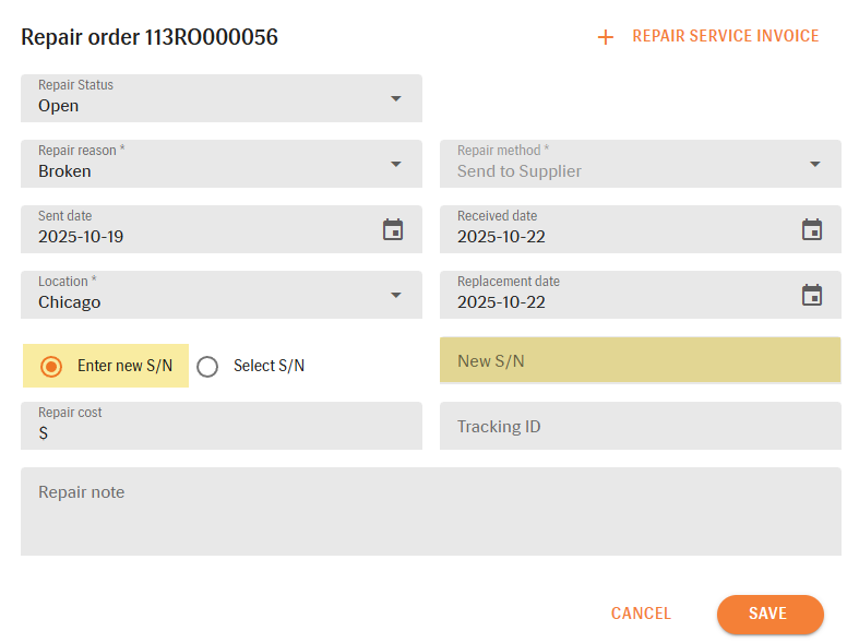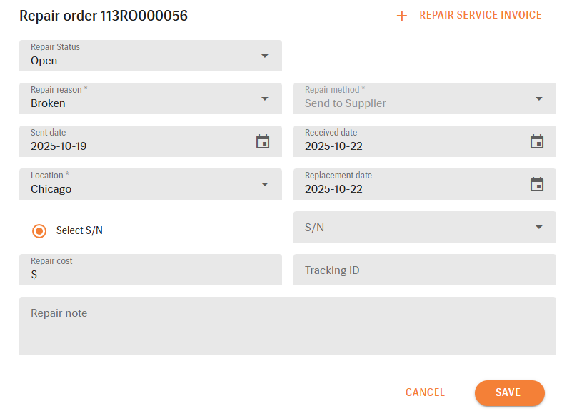 If a user does not have the required permissions, the option to manually enter a serial number in Repair Orders and Loss & Damage (L&D) Requests will not be available: