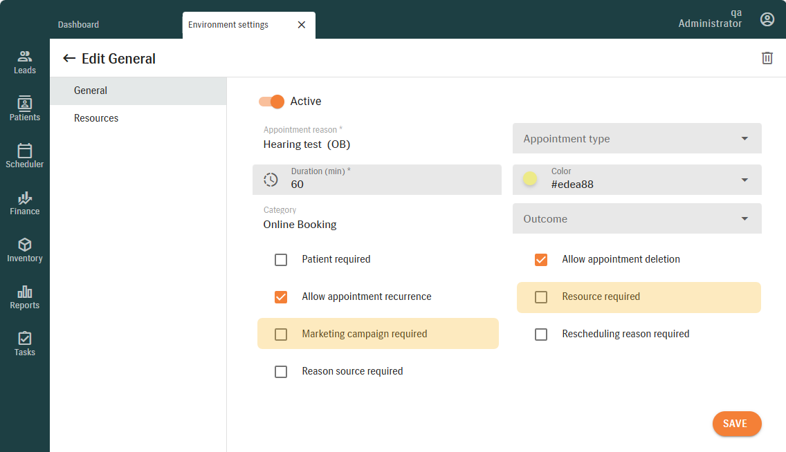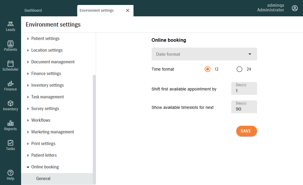 Once Online Booking is enabled for a clinic, the Online Booking tab appears in Environment Settings.