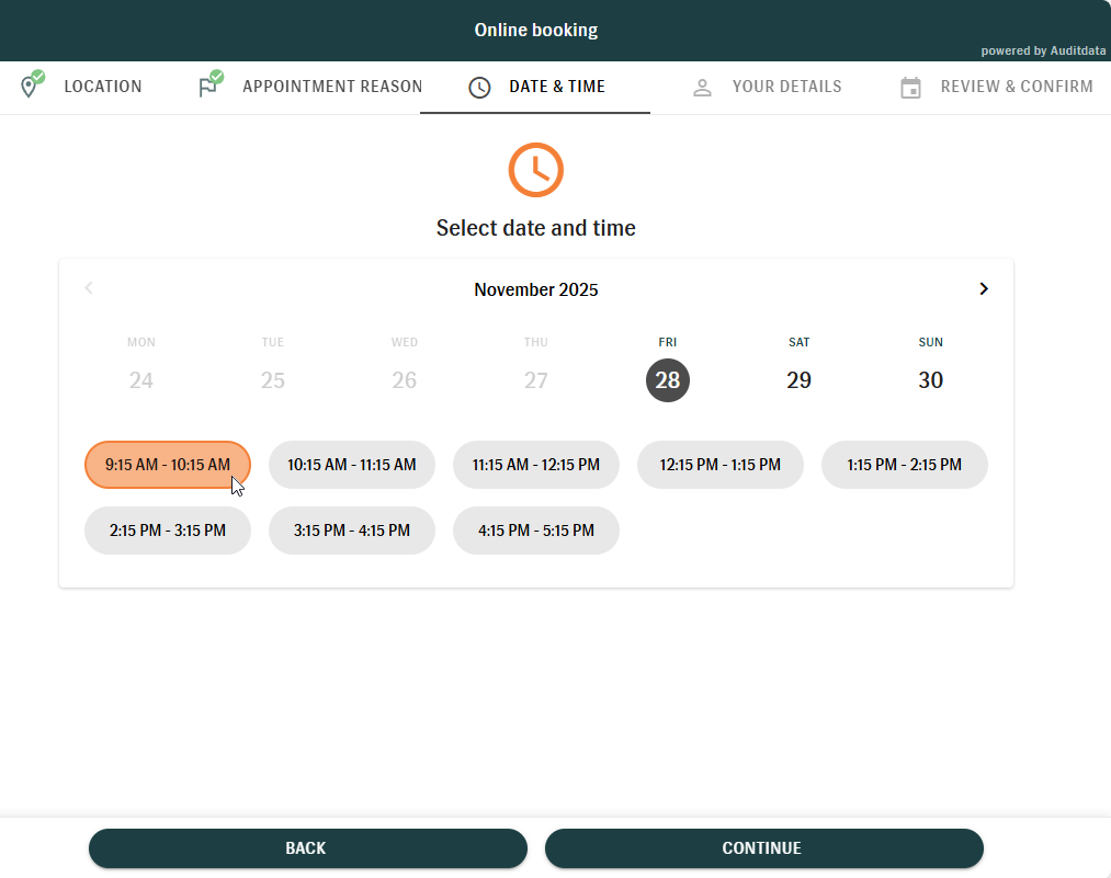 Available time slots are displayed dynamically based on the clinic’s configured settings.