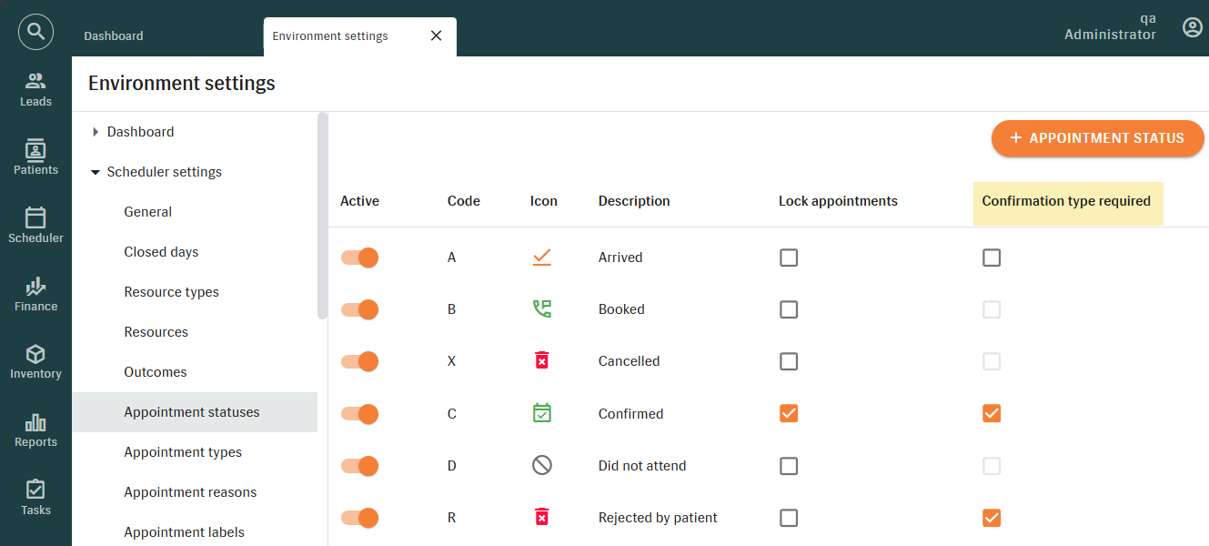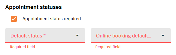 Via statuses, it is possible to manage appointment confirmations by selecting the corresponding option under "Confirmation type required". Note that not all statuses can be associated with confirmation types.