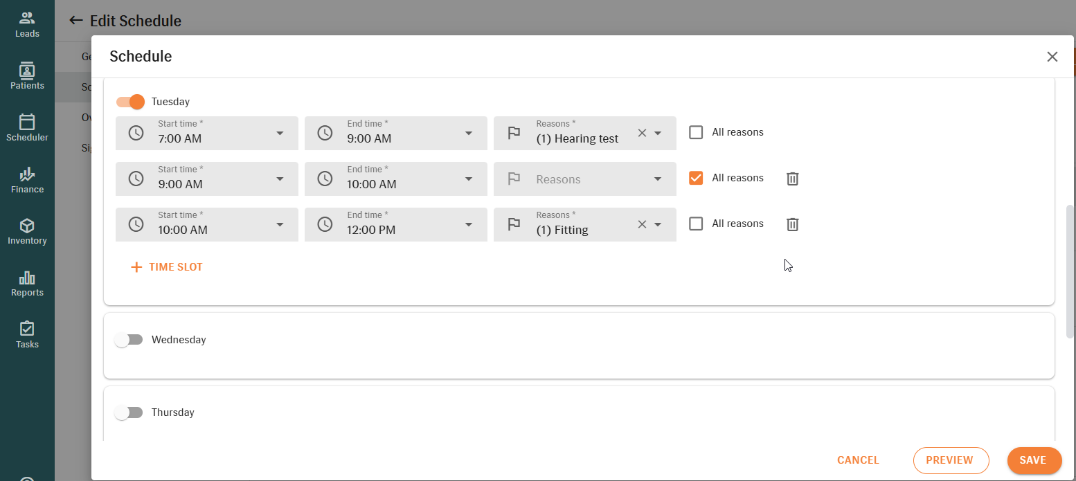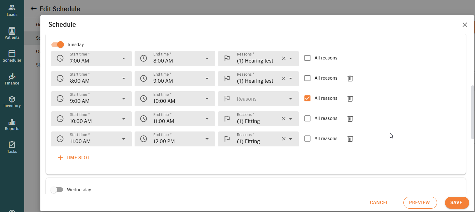 - Any unblocked hours will automatically be available for all appointment reasons.