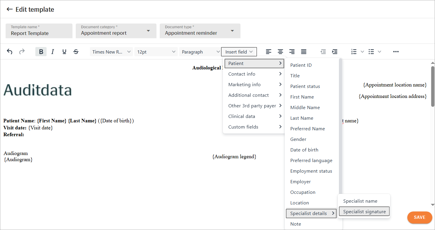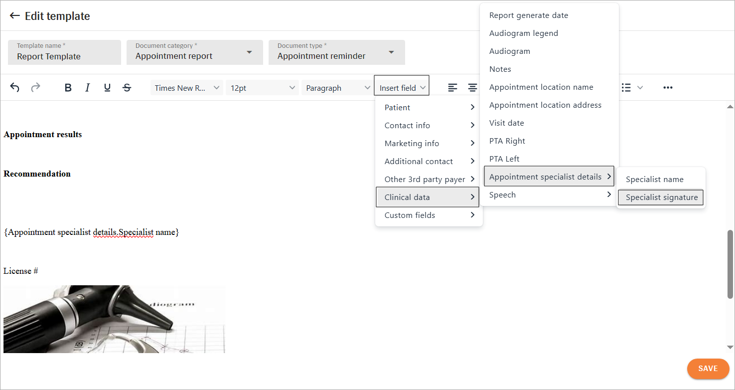 Use signature insert fields when configuring templates for Patient letters, Appointment reports and Battery & Maintenance Claims: