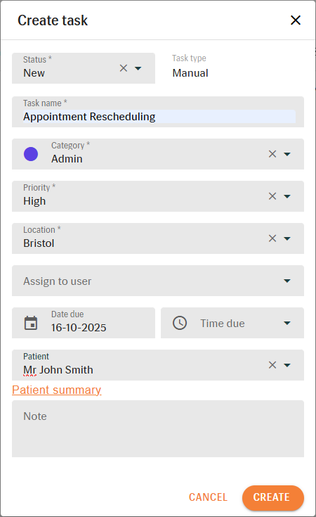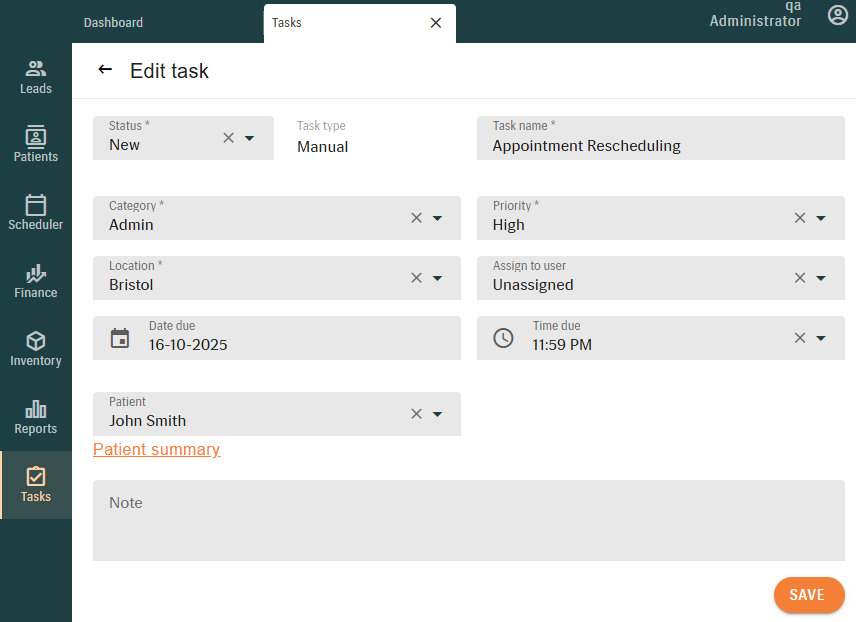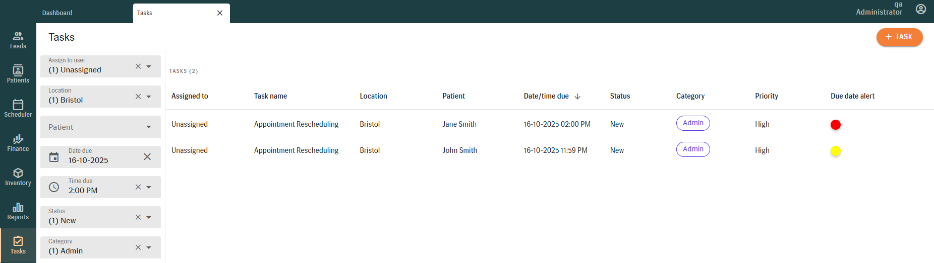 When you open the TASKS module, you will see all incomplete tasks scheduled for the current day. By default, the task list displays tasks that are either assigned to you or unassigned, up until 11:59 p.m. The Due Date Alert column highlights tasks that are either overdue or approaching their deadline, helping you prioritize what needs attention.